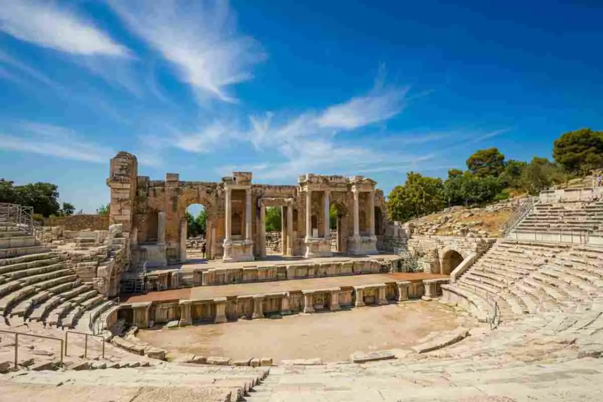 La cavea del teatro è dominata da una terrazza, tagliata nella roccia del sovrastante colle Temenite. A questo si accedeva tramite una scalinata al centro, e una strada incassata sulla sinistra (a ovest), nota come via dei Sepolcri. Lo spianamento artificiale era occupato da un grande portico a L, che includeva la metà occidentale della cavea. Di questo portico è oggi visibile solo una banchina tagliata nella roccia, a 7,40 m dalle pareti di fondo, che costituiva la fondazione del colonnato frontale. Restano anche tratti della pavimentazione in cocciopesto, e fori per le travi del tetto nel tratto di parete rocciosa conservato per una notevole altezza (fino a 8,56 m) sul lato nord. In fondo al portico era anche una banchina, alta e larga 0,45 m, conservata in alcuni tratti all’estremità ovest del portico settentrionale.